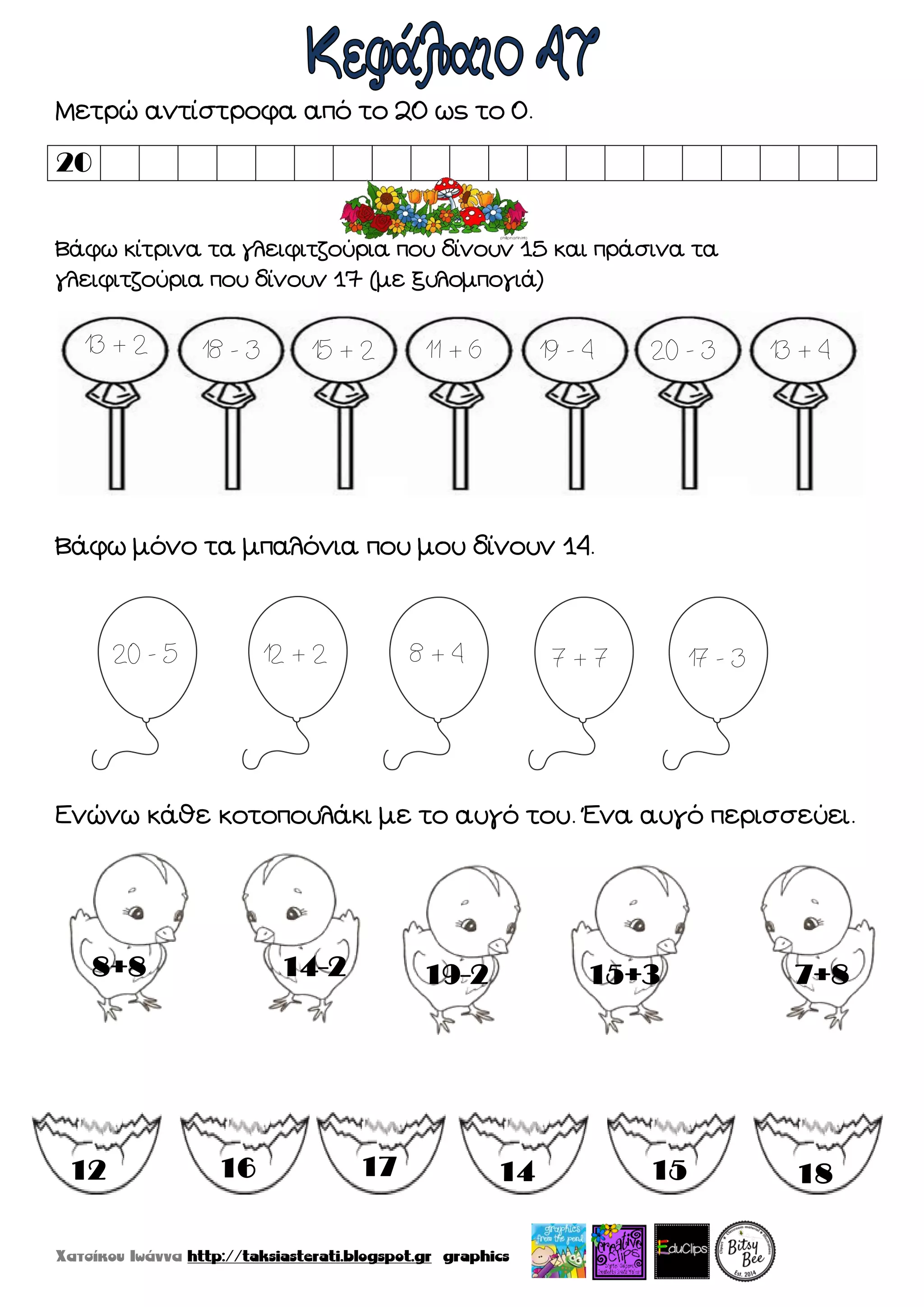 το 20 ως το 0. 20 Βάφω κίτρινα τα γλειφιτζούρια που δίνουν 15 και πράσινα τα γλειφιτζούρια που δίνουν 17 (με ξυλομπογιά) Βάφω μόνο τα μπαλόνια που μου δίνουν 14. Ενώνω κάθε κοτοπουλάκι με το αυγό του. Ένα αυγό περισσεύει. 13 + 2 15 + 218 - 3 11 + 6 19 - 4 20 - 3 13 + 4 20 - 5 12 + 2 7 + 78 + 4 17 - 3 8+8 19-214-2 7+815+3 12 18151716 14