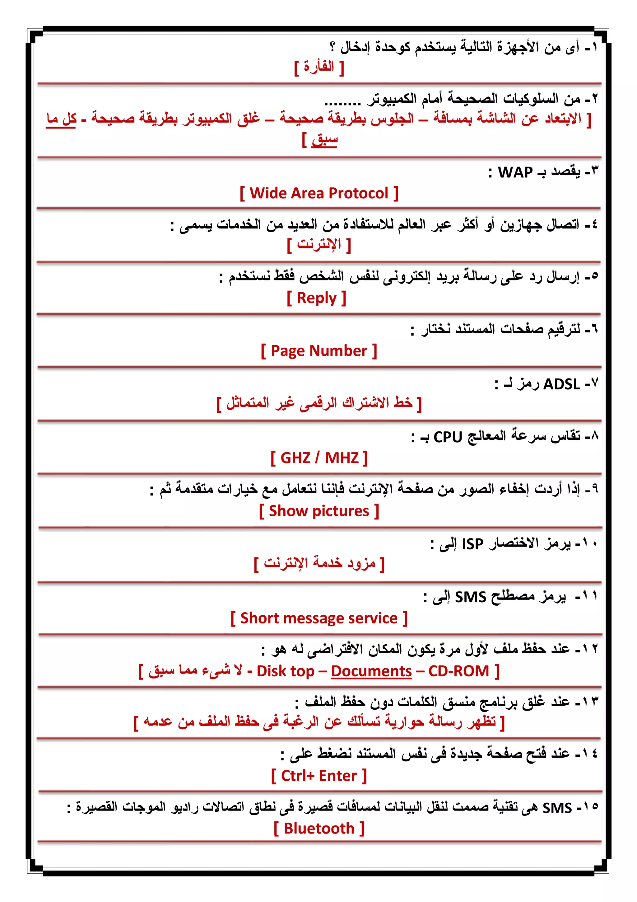 يتناول المستند مجموعة من الأسئلة المتعلقة بتكنولوجيا المعلومات والكمبيوتر، بما في ذلك استخدام الأجهزة، البرمجيات، البروتوكولات، وأنظمة التشغيل. كما يتضمن معلومات حول التعامل مع البريد الإلكتروني، معالجة النصوص، والشبكات. المستند يوفر معلومات أساسية ضرورية للمستخدمين لفهم أساسيات الكمبيوتر والإنترنت.