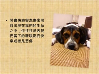 其實快樂與悲傷常同時出現在我們的生命之中,但往往是因我們當下的著眼點而快樂或者是悲傷