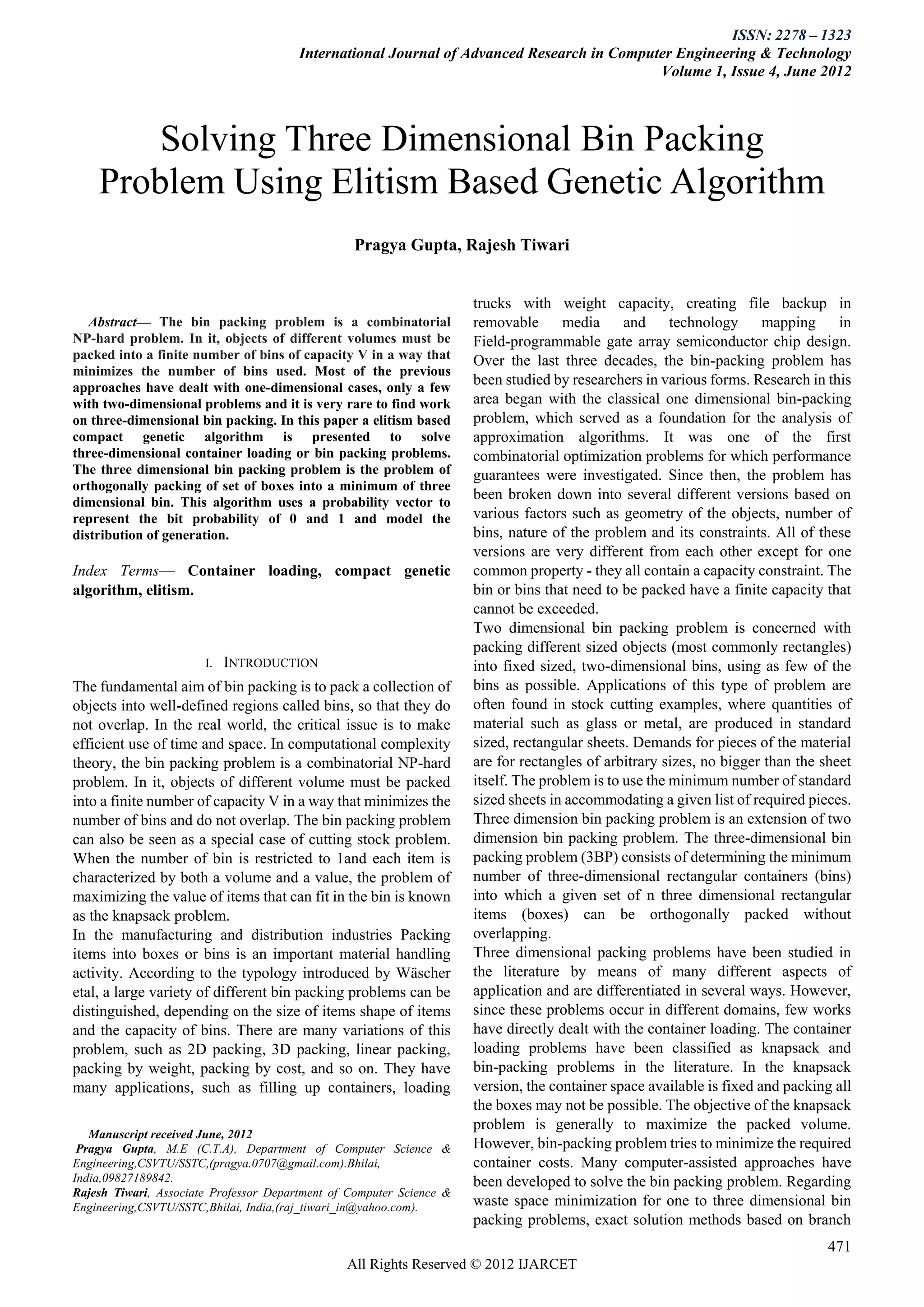 This document summarizes a research paper on solving three-dimensional bin packing problems using an elitism-based genetic algorithm. The paper addresses the bin packing problem, which involves packing objects of different volumes into bins to minimize the number of bins used. Previous work focused on one and two-dimensional cases. The paper presents a genetic algorithm approach to solve the three-dimensional bin packing problem. The algorithm uses a probability vector to model population distribution and elitism to guide the search toward optimal solutions.