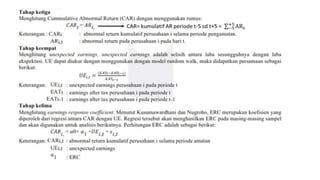 Dokumen ini membahas tentang faktor yang mempengaruhi earning response coefficient (ERC) yang berfungsi sebagai indikator reaksi pasar terhadap informasi laba perusahaan. Penelitian dilakukan melalui beberapa tahap pengukuran regresi dengan menggunakan data dari 140 pengamatan dan memformulasikan hubungan antara kejutan laba dan return abnormal. Hasil analisis regresi menunjukkan hubungan antara ERC dengan faktor-faktor seperti leverage, capital expenditure, manajemen laba, likuiditas, dan ukuran perusahaan.
