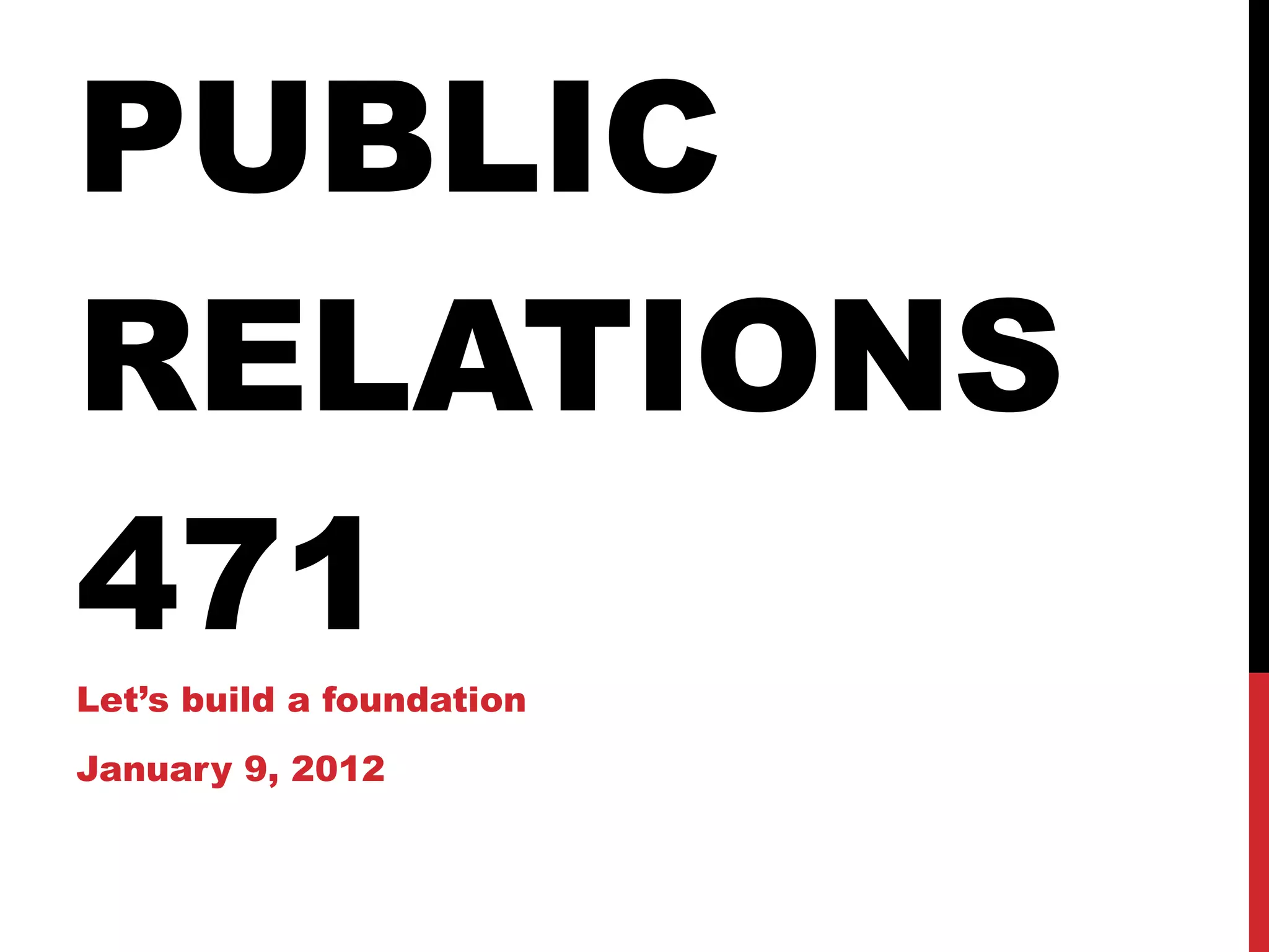 This document provides an overview of public relations research, objectives, programming, and evaluation. It discusses the three types of research: client research, opportunity/problem research, and audience research. It also outlines quantitative and non-quantitative research methods. The document reviews how to set measurable objectives and the hierarchy of output, impact, informational, attitudinal, and behavioral objectives. It discusses programming themes, events, media use, and communication. Finally, it covers evaluating objectives through metrics like surveys, website analytics, and measuring message exposure, comprehension, and retention.