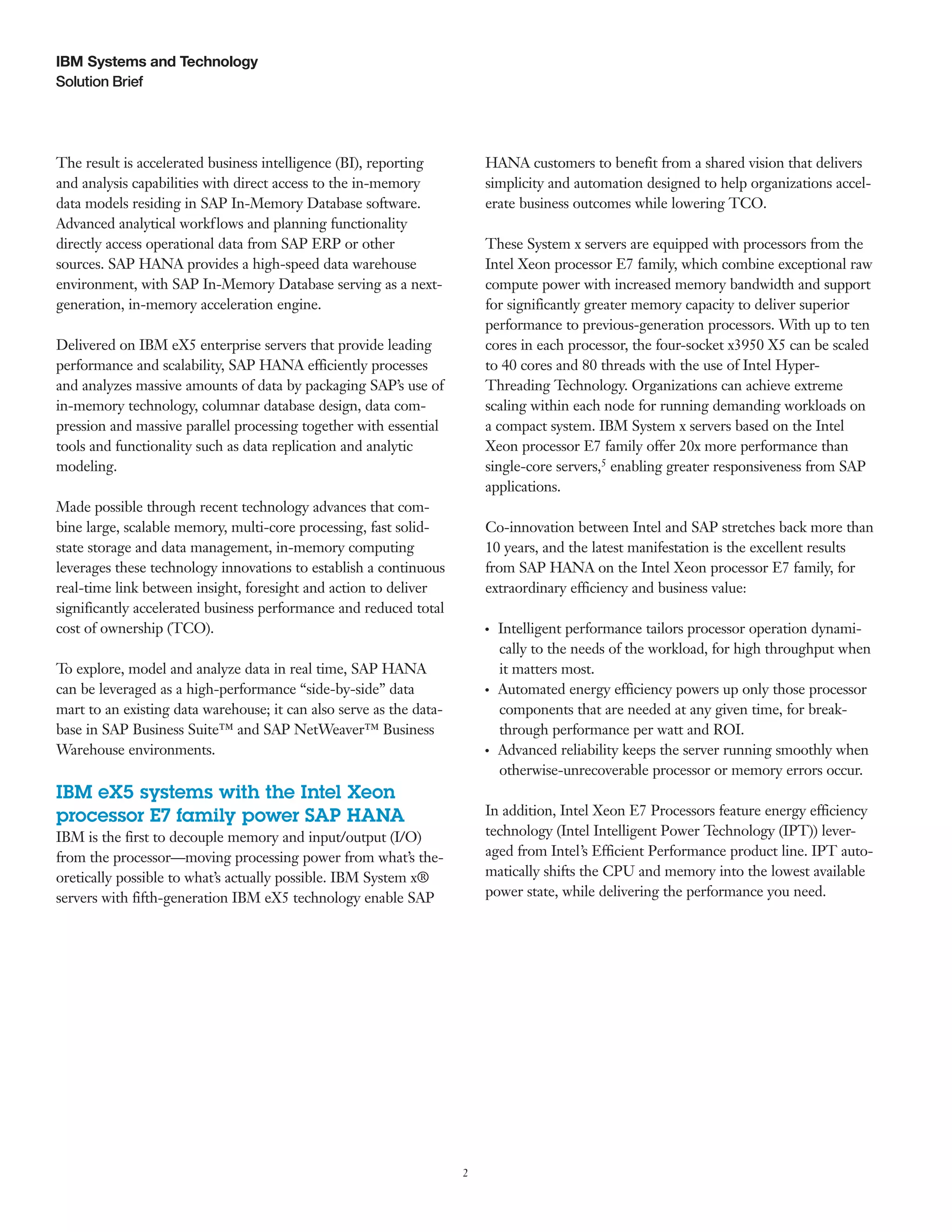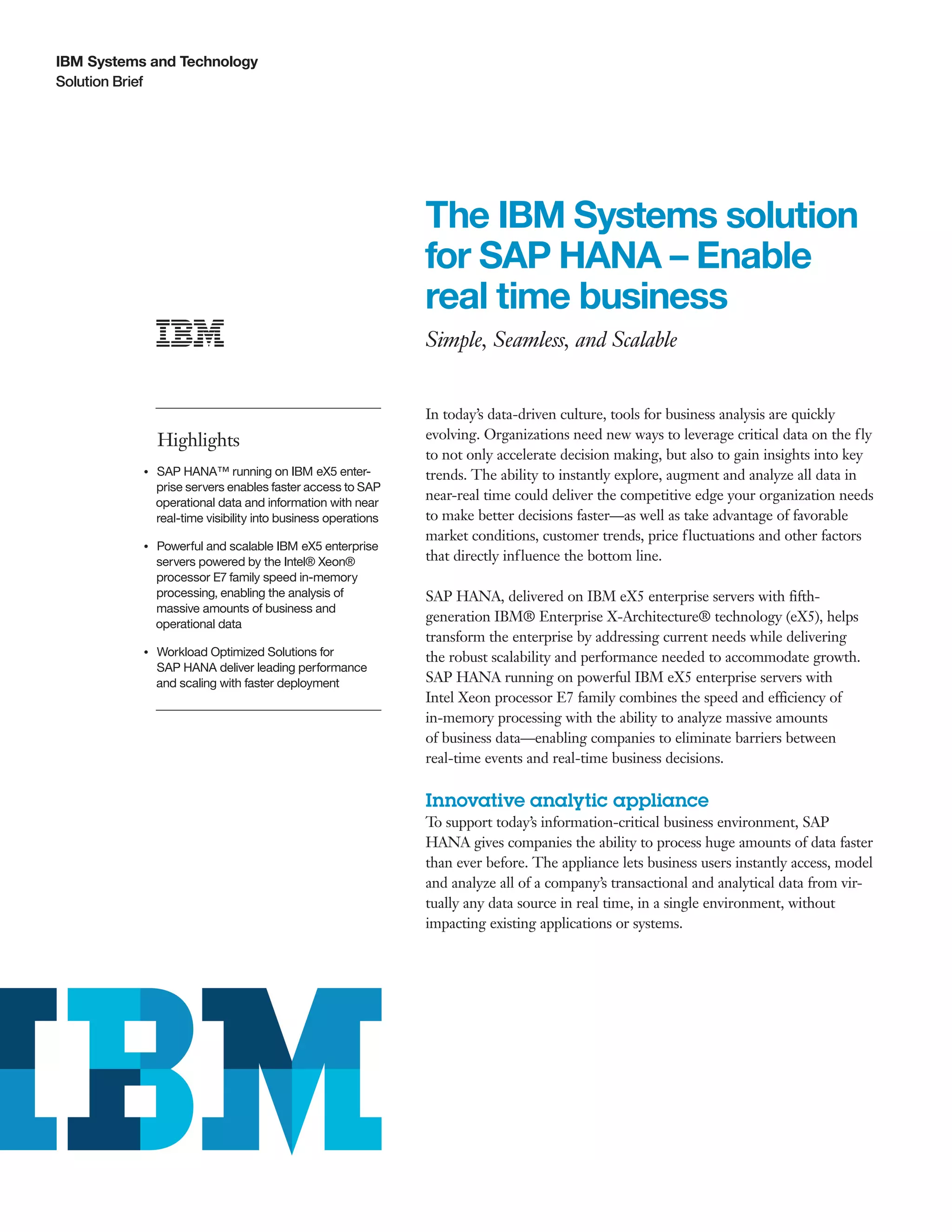 The document outlines IBM's systems solution for SAP HANA, highlighting its ability to enable real-time business insights through in-memory processing on IBM EX5 enterprise servers. It emphasizes the scalability, performance, and efficiency provided by the combination of SAP HANA and Intel Xeon processors, which facilitates faster data access and analysis while reducing total cost of ownership. Additionally, the solution supports various workloads and offers advanced data protection and management features to help organizations meet growing data demands and enhance operational efficiency.