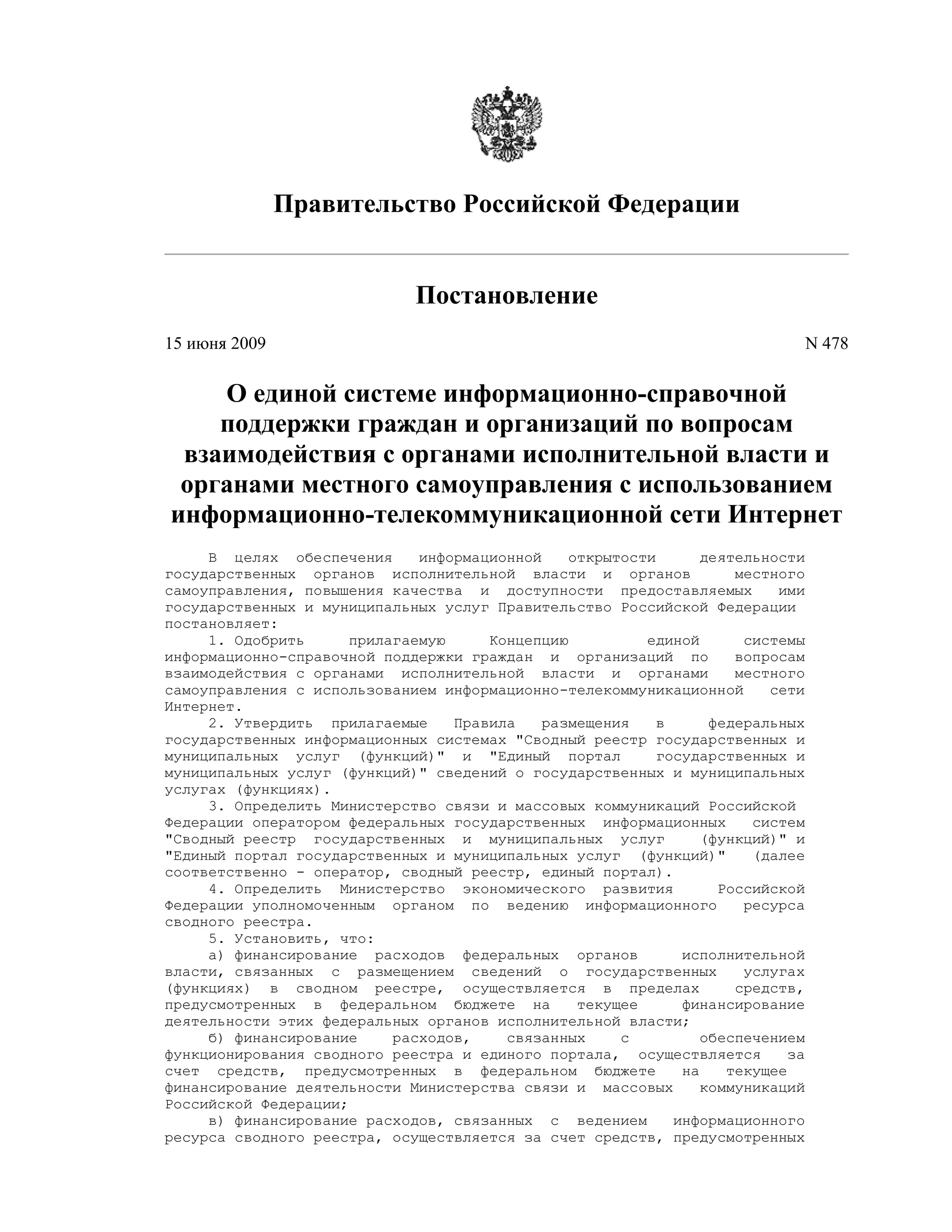 Постановление правительства Российской Федерации от 15 июня 2009 года определяется создание единой системы информационно-справочной поддержки для граждан и организаций по взаимодействию с органами власти через интернет. Утверждаются концепция и правила размещения информации о государственных и муниципальных услугах в федеральных системах, а также назначаются ответственные министерства и органы. Основная цель системы — обеспечение открытости и доступности государственных услуг, улучшение их качества и быстроты предоставления.