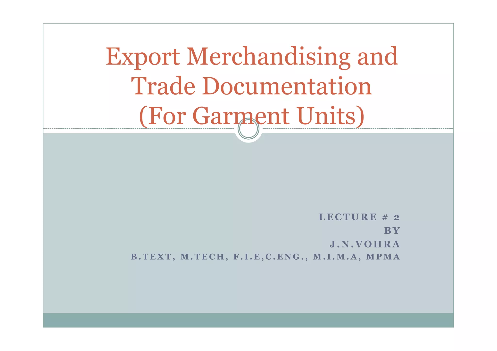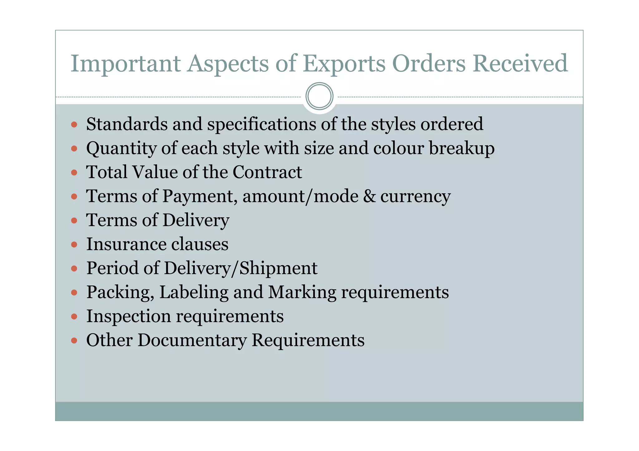 This document discusses important aspects of export orders and documentation for garment units. It outlines key elements of sales contracts such as product specifications, quantities, prices, delivery dates and payment terms. It also describes important checks to be made when receiving a letter of credit, including ensuring correct pricing, quantities, validity dates and shipment details. Finally, it discusses preparing shipments by properly packing, labeling and documenting goods as well as obtaining necessary inspection reports and insurance policies and preparing documents like invoices and packing lists for processing payments.