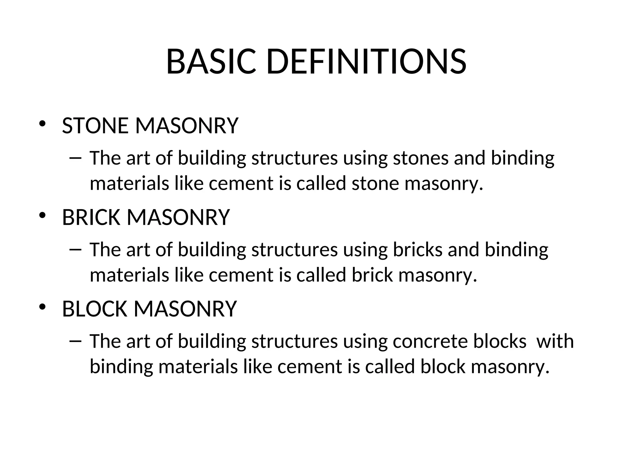 The document provides a comprehensive overview of masonry types, including stone, brick, and block masonry, along with definitions of various terms and concepts relevant to masonry work. It covers the classification of masonry, requirements for good bond and construction practices, as well as tools used by masons and the types of defects and maintenance needed. Additionally, it distinguishes between rubble and ashlar stone masonry types and introduces lifting appliances relevant to stone masonry.