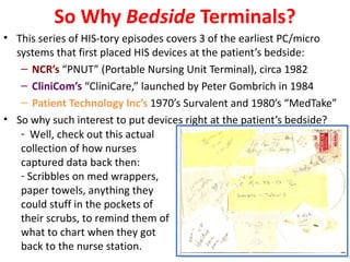 This document summarizes the history of MedTake, one of the earliest bedside terminal systems for hospitals. It describes MedTake's origins in the 1970s and its acquisition by Micro Healthsystems in the 1980s. The narrator discusses his involvement in leading MedTake sales after being recruited by Jim Pesce. Bedside terminals aimed to address the problem of illegible paper notes by nurses by allowing documentation at the patient's bedside.