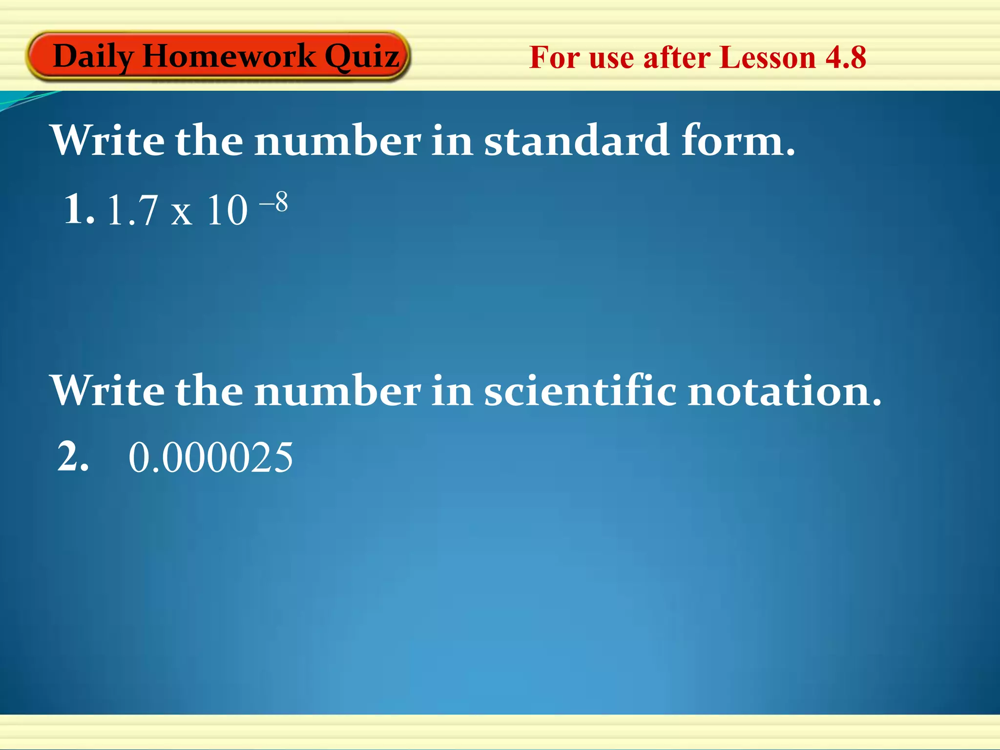 The document contains a daily homework quiz with two questions that ask the student to write a number in standard form and scientific notation. It also contains examples of ordering numbers in scientific notation from least to greatest and an assignment asking the student to complete practice problems writing and ordering numbers in scientific notation. The practice problems are meant to reinforce the concepts taught in Lesson 4.8 on scientific notation.