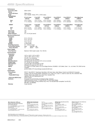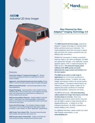 The document summarizes the Industrial 2D Area Imager 4800i. It can read both linear and 2D barcodes as well as capture signatures, photos, and perform OCR. It has an impact absorbent housing that can withstand 50 drops from 6.5 feet. The 4800i has an IP54 rating, 5-year warranty, and uses Adaptus Imaging Technology 5.0 for fast and versatile scanning in various industrial applications such as manufacturing and package delivery.