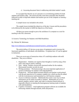 The document discusses several methods and technologies for teaching English to students with disabilities. It describes approaches for absolute and false beginners, using computers in the classroom, assistive technologies for mild disabilities, empowering rural students with disabilities through assistive tech, how computer technology can help learning disabilities, modifications for students with learning disabilities in inclusive settings, equipment needed for language learners, maximizing language learning through total physical response methods, using total physical response in the classroom, and using computer-assisted language learning in the ESL classroom.
