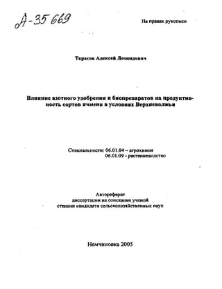 Диссертация Алексея Тарасова исследует влияние азотных удобрений и биопрепаратов на продуктивность сортов ячменя в Верхневолжье с целью оптимизации агротехнологий. Результаты показывают, что использование микробиологических препаратов увеличивает урожайность аналогично минеральным удобрениям, улучшая при этом качество зерна. Работа включает в себя агрономическую оценку и экономическую оценку применения удобрений и биопрепаратов, что может служить основой для дальнейших агрономических практик.