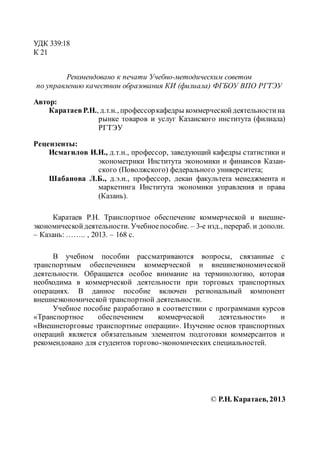 Учебное пособие Р. Н. Каратаева посвящено транспортному обеспечению коммерческой и внешнеэкономической деятельности, включает вопросы, связанные с различными видами транспорта и их спецификой. В документе рассматривается терминология, а также представлены классификации транспортных средств, документации и условий перевозок. Пособие ориентировано на студентов торгово-экономических специальностей и рекомендовано для изучения транспортных операций.