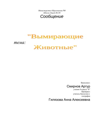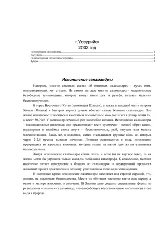 Документ описывает редкие и охраняемые виды животных, таких как исполинские саламандры, выхухоль, галапагоссская гигантская черепаха и зубры, подчеркивая их угрозы и усилия по охране. Исполинские саламандры находятся под защитой из-за чрезмерного истребления, выхухоль страдает от разрушения среды обитания, а галапагоссские черепахи были истреблены из-за китобойного промысла. Зубры почти вымерли, но благодаря программам восстановления их численность возросла, и они были расселены в новые ареалы.