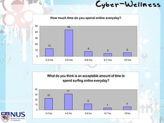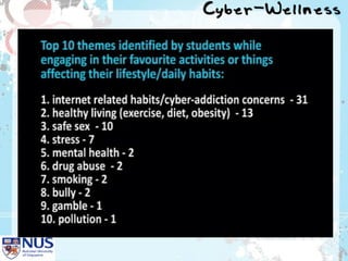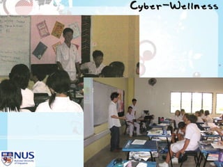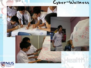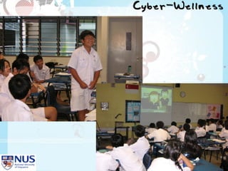 Project Cyber Wellness at Nan Hua High School aimed to raise awareness of internet addiction among students. It identified excessive internet use as a key issue through surveys and focus groups. An information and communications club worked with students to show an educational video and hold class discussions. A post-evaluation found increased awareness of internet addiction and intentions to reduce online time and prioritize schoolwork and family. Future plans included expanding the program school-wide and developing additional educational activities.