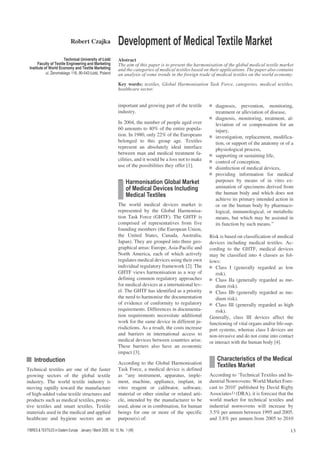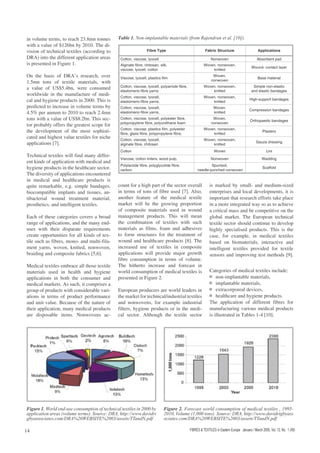 The document summarizes the development of the global medical textile market and categories of medical textiles based on their applications. It analyzes trends in the world trade of medical textiles. The medical textile market is growing due to factors like population growth, aging populations, and increased health awareness. Growth rates are above average, driven by developing countries in Asia and Western markets. The prospects for medical textiles are strong, especially for nonwoven materials and disposable products used in surgical settings.
