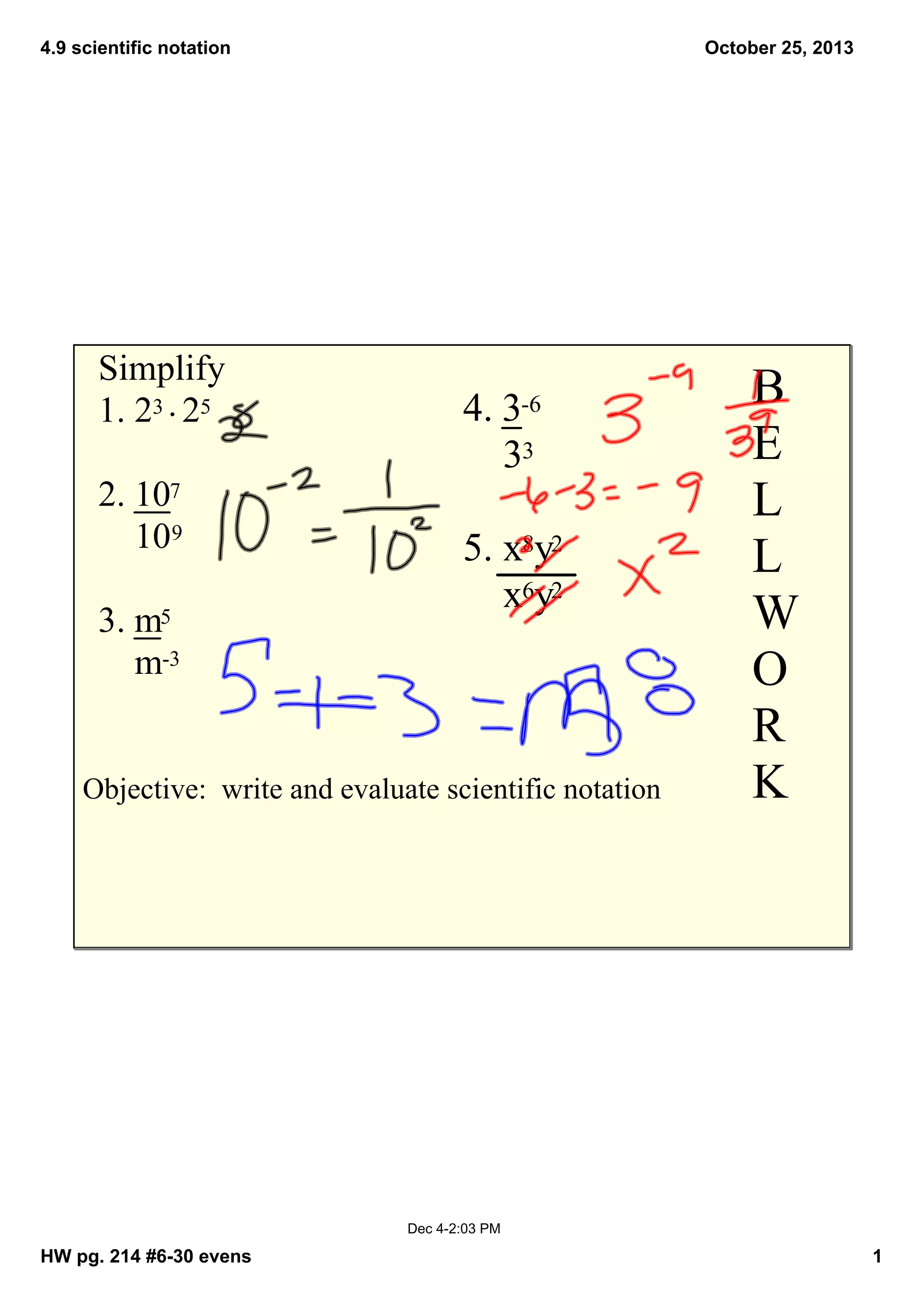 This document appears to be notes from a class on scientific notation. It includes examples of writing very large and small numbers using scientific notation, explanations of the components of scientific notation, practice problems solving expressions in scientific notation and ordering numbers written in scientific notation. The document also provides homework assignments involving scientific notation problems.