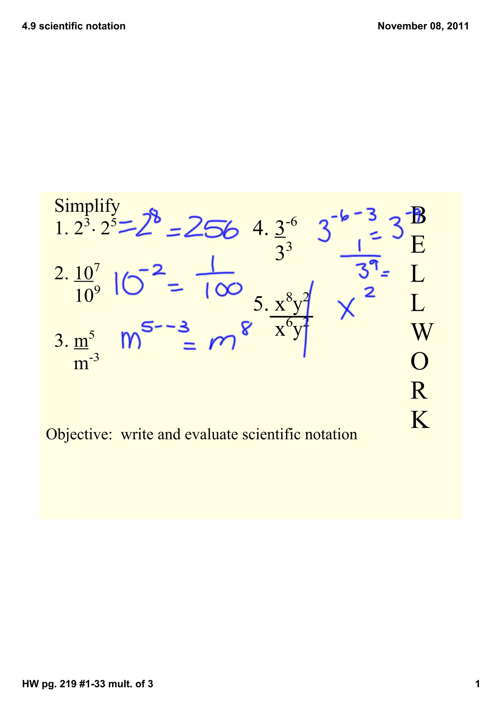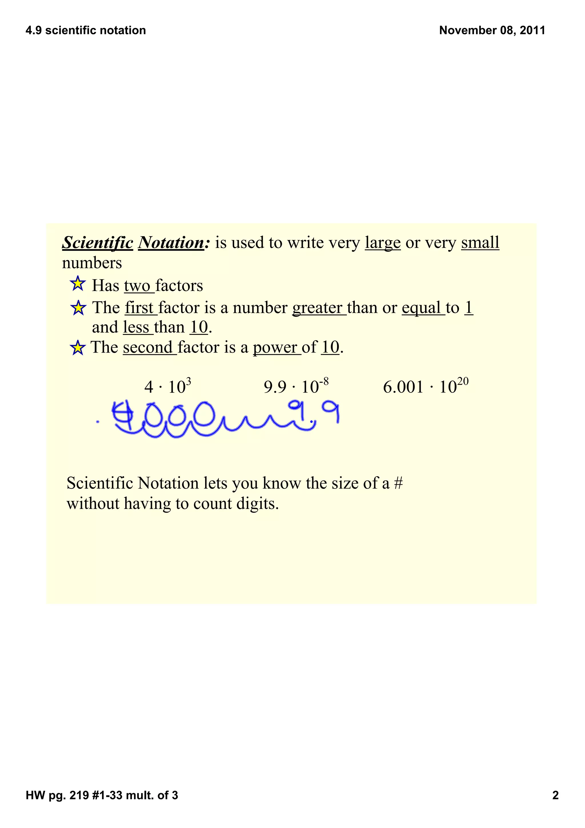 This document provides information about scientific notation and examples for writing numbers in scientific notation and standard form. It includes exercises for writing numbers in scientific notation, ordering numbers written in scientific notation, multiplying numbers in scientific notation, and converting between scientific notation and standard decimal form. The key aspects of scientific notation covered are that it expresses numbers as a value between 1 and 10 multiplied by a power of 10.