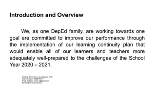 Bonliw Elementary School's Learning Continuity Plan aims to ensure the delivery of quality education amidst the COVID-19 pandemic through various teaching modalities and support to learners, staff, and parents. The school is committed to maintaining safety and health standards while providing educational resources and guidance to adapt to new learning environments. Key components include modular teaching, parent engagement, and strategies to address the unique needs of students in this challenging period.
