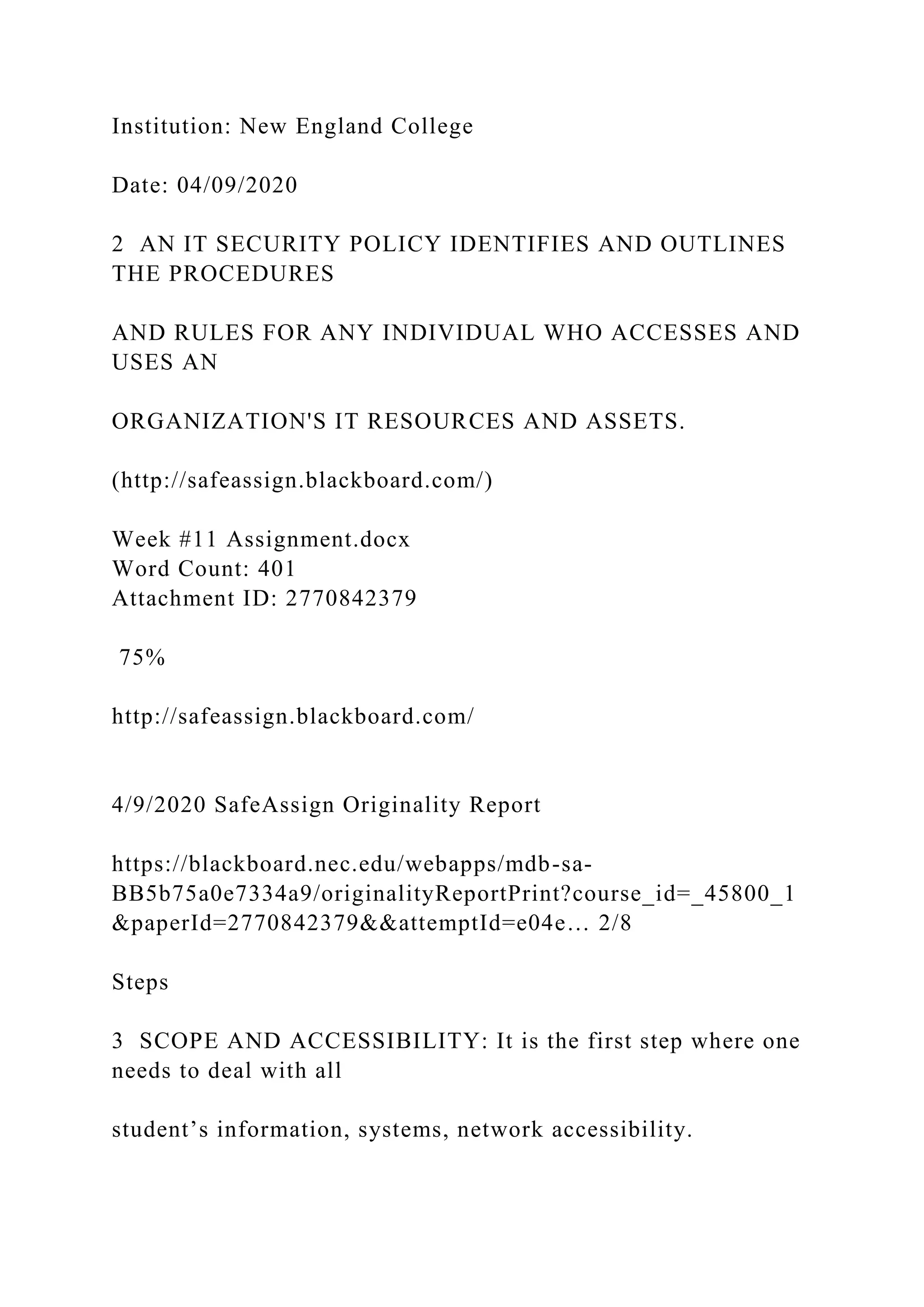 The document is a SafeAssign originality report for an IT security policy assignment submitted by Ruthvik Reddy Gidde at New England College, indicating a 75% match to other student papers. It outlines various components of the IT security policy, including data classification, consequences of data handling, and mobile device and network security policies. The assignment also includes various analysis tasks related to pricing strategies in an oligopoly market scenario for a course evaluation.