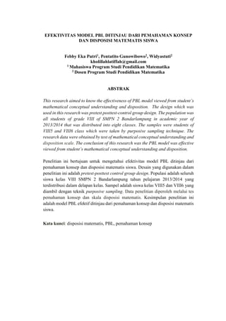 Penelitian ini mengevaluasi efektivitas model pembelajaran berbasis masalah (PBL) terhadap pemahaman konsep dan disposisi matematis siswa kelas VIII di SMPN 2 Bandarlampung. Hasil penelitian menunjukkan bahwa PBL secara signifikan meningkatkan pemahaman konsep matematis dan disposisi siswa, dibandingkan dengan metode pembelajaran langsung. Dengan menggunakan desain penelitian pretest-posttest control group, data dikumpulkan melalui tes pemahaman konsep dan skala disposisi matematis, menunjukkan bahwa siswa yang belajar dengan PBL memiliki hasil yang lebih baik.