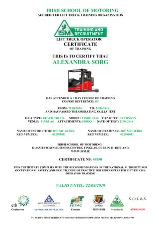 This certificate certifies that Alexandra Sorg attended and passed a two-day training course to operate a reach truck from April 21-22, 2016 at the Irish School of Motoring in Finglas, Dublin. The course covered operating skills for a Linde R16 reach truck with a 1.6 tonne capacity and fork attachments. Alexandra passed the operating skills test on April 22, 2016 administered by instructor and examiner Joe Mc Guirk. The certificate is valid until April 22, 2019 and complies with national safety standards for lift truck operator training.