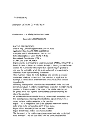 This document describes British patent GB785368 (A) filed in 1957 regarding improvements to metal structures. It involves a framework of tubular members interconnected by junction members that fit into the bores of the tubular members. Sheet metal forms the skin of the structure. The framework comprises spaced horizontal and inclined tubular members joined by T-shaped, cruciform, and other specially shaped junction members. At assembly, sheet metal panelling is applied and secured to the frame with bolts or rivets to lock the joints. This allows for simple, inexpensive and readily assemblable metal framed structures like portable buildings.