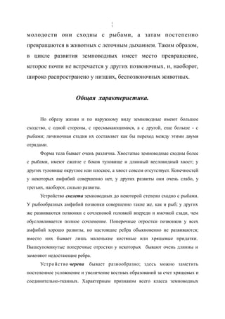 Доклад описывает земноводных, их жизненные циклы, анатомию и поведение. Земноводные, отличающиеся от других позвоночных, проходят стадию личинок и обладают особенностями, такими как дыхание через кожу и разнообразное строение скелета. Они живут в разнообразных средах, требуют воду для существования и имеют различные адаптации к условиям окружающей среды.