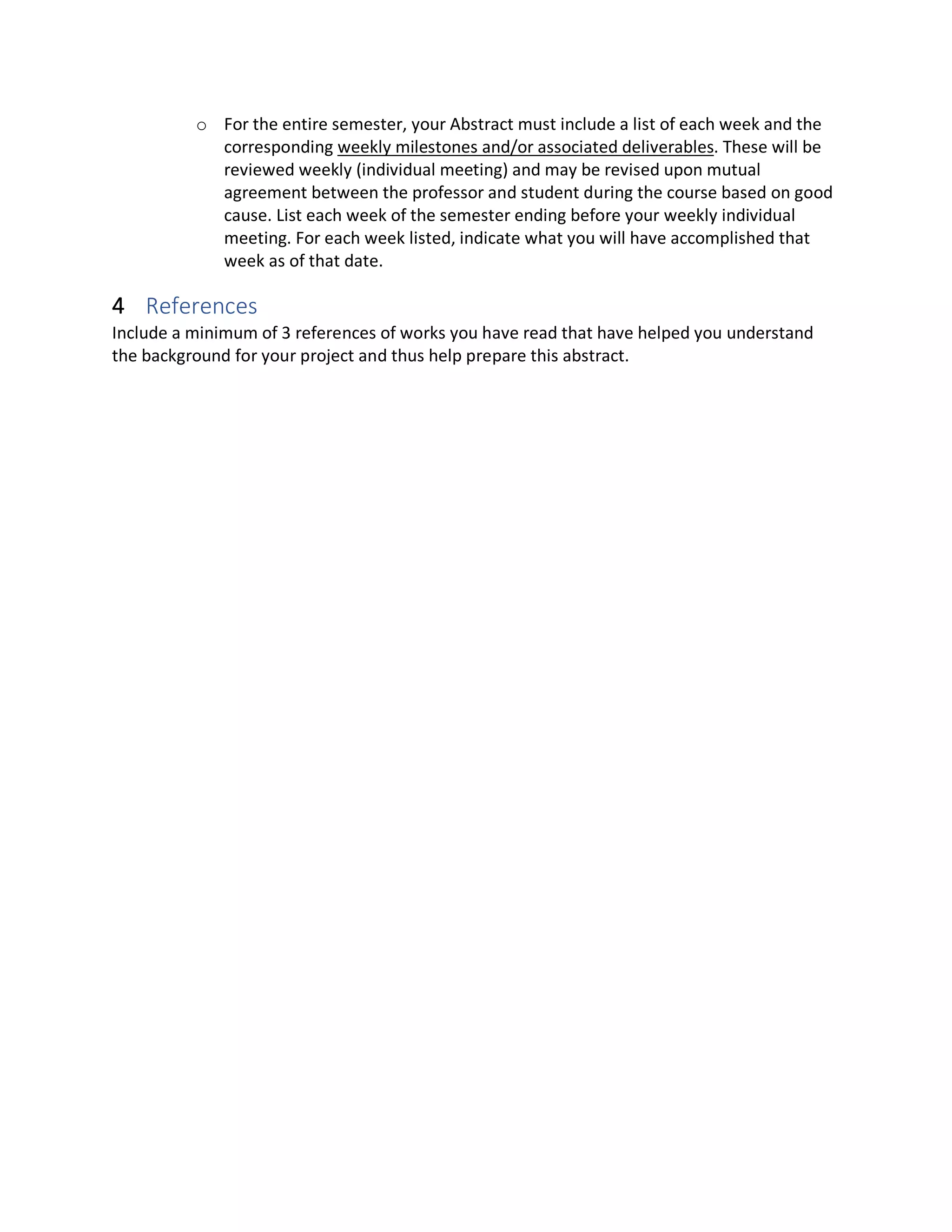 This document provides a template for a project proposal abstract that must be followed. The abstract will guide the student and professor throughout the semester and be reviewed during weekly meetings. It includes sections for an introduction establishing the research problem and objectives, a technical description of the proposed solution, a project plan with milestones and deliverables for each week of the semester, and references. The current version of the abstract should be brought to weekly meetings for review and potential revision.