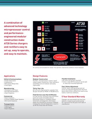 The document describes the AT30 Series float battery chargers which have 3 phase input and are CSA and UL compliant. They have applications in power generation, substations, manufacturing, commercial, and transportation industries. The chargers have modular construction for easy maintenance, a 30-year life, field service under 60 minutes, and flexible installation options. They also have online adjustment capabilities, a 5 year warranty, and produce less than 65dBA noise.