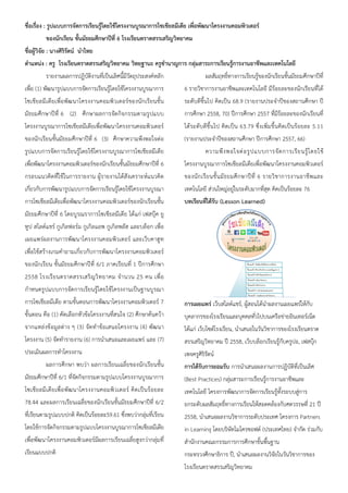 เพื่อพัฒนาโครงงานคอมพิวเตอร# ของนักเรียน ชั้นมัธยมศึกษาป*ที่ 6 โรงเรียนตราดสรรเสริญวิทยาคม ชื่อผูวิจัย : นางศิริรัตน# นําไทย ตําแหน3ง : ครู โรงเรียนตราดสรรเสริญวิทยาคม วิทยฐานะ ครูชํานาญการ กลุ3มสาระการเรียนรูการงานอาชีพและเทคโนโลยี รายงานผลการปฏิบัติงานที่เปนเลิศนี้มีวัตถุประสงคหลัก เพื่อ (1) พัฒนารูปแบบการจัดการเรียนรู+โดยใช+โครงงานบูรณาการ โซเชียลมีเดียเพื่อพัฒนาโครงงานคอมพิวเตอรของนักเรียนชั้น มัธยมศึกษาป5ที่ 6 (2) ศึกษาผลการจัดกิจกรรมตามรูปแบบ โครงงานบูรณาการโซเชียลมีเดียเพื่อพัฒนาโครงงานคอมพิวเตอร ของนักเรียนชั้นมัธยมศึกษาป5ที่ 6 (3) ศึกษาความพึงพอใจต9อ รูปแบบการจัดการเรียนรู+โดยใช+โครงงานบูรณาการโซเชียลมีเดีย เพื่อพัฒนาโครงงานคอมพิวเตอรของนักเรียนชั้นมัธยมศึกษาป5ที่ 6 กรอบแนวคิดที่ใช+ในการรายงาน ผู+รายงานได+สังเคราะหแนวคิด เกี่ยวกับการพัฒนารูปแบบการจัดการเรียนรู+โดยใช+โครงงานบูรณา การโซเชียลมีเดียเพื่อพัฒนาโครงงานคอมพิวเตอรของนักเรียนชั้น มัธยมศึกษาป5ที่ 6 โดยบูรณราการโซเชียลมีเดีย ได+แก9 เฟสบุ<ค ยู ทูป สไลดแชร กูเกิลฟอรม กูเกิลแอพ กูเกิลพลัส และบล็อก เพื่อ เผยแพร9ผลงานการพัฒนาโครงงานคอมพิวเตอร และเว็บคาฮูท เพื่อใช+สร+างเกมคําถามเกี่ยวกับการพัฒนาโครงงานคอมพิวเตอร ของนักเรียน ชั้นมัธยมศึกษาป5ที่ 6/1 ภาคเรียนที่ 1 ป5การศึกษา 2558 โรงเรียนตราดสรรเสริญวิทยาคม จํานวน 25 คน เพื่อ กําหนดรูปแบบการจัดการเรียนรู+โดยใช+โครงงานเปนฐานบูรณา การโซเชียลมีเดีย ตามขั้นตอนการพัฒนาโครงงานคอมพิวเตอร 7 ขั้นตอน คือ (1) คัดเลือกหัวข+อโครงงานที่สนใจ (2) ศึกษาค+นคว+า จากแหล9งข+อมูลต9าง ๆ (3) จัดทําข+อเสนอโครงงาน (4) พัฒนา โครงงาน (5) จัดทํารายงาน (6) การนําเสนอและเผยแพร9 และ (7) ประเมินผลการทําโครงงาน ผลการศึกษา พบว9า ผลการเรียนเฉลี่ยของนักเรียนชั้น มัธยมศึกษาป5ที่ 6/1 ที่จัดกิจกรรมตามรูปแบบโครงงานบูรณาการ โซเชียลมีเดียเพื่อพัฒนาโครงงานคอมพิวเตอร คิดเปนร+อยละ 78.44 และผลการเรียนเฉลี่ยของนักเรียนชั้นมัธยมศึกษาป5ที่ 6/2 ที่เรียนตามรูปแบบปกติ คิดเปนร+อยละ59.61 ซึ่งพบว9ากลุ9มที่เรียน โดยใช+การจัดกิจกรรมตามรูปแบบโครงงานบูรณาการโซเชียลมีเดีย เพื่อพัฒนาโครงงานคอมพิวเตอรมีผลการเรียนเฉลี่ยสูงกว9ากลุ9มที่ เรียนแบบปกติ ผลสัมฤทธิ์ทางการเรียนรู+ของนักเรียนชั้นมัธยมศึกษาป5ที่ 6 รายวิชาการงานอาชีพและเทคโนโลยี มีร+อยละของนักเรียนที่ได+ ระดับดีขึ้นไป คิดเปน 68.9 (รายงานประจําป5ของสถานศึกษา ป5 การศึกษา 2558, 70) ป5การศึกษา 2557 ที่มีร+อยละของนักเรียนที่ ได+ระดับดีขึ้นไป ค