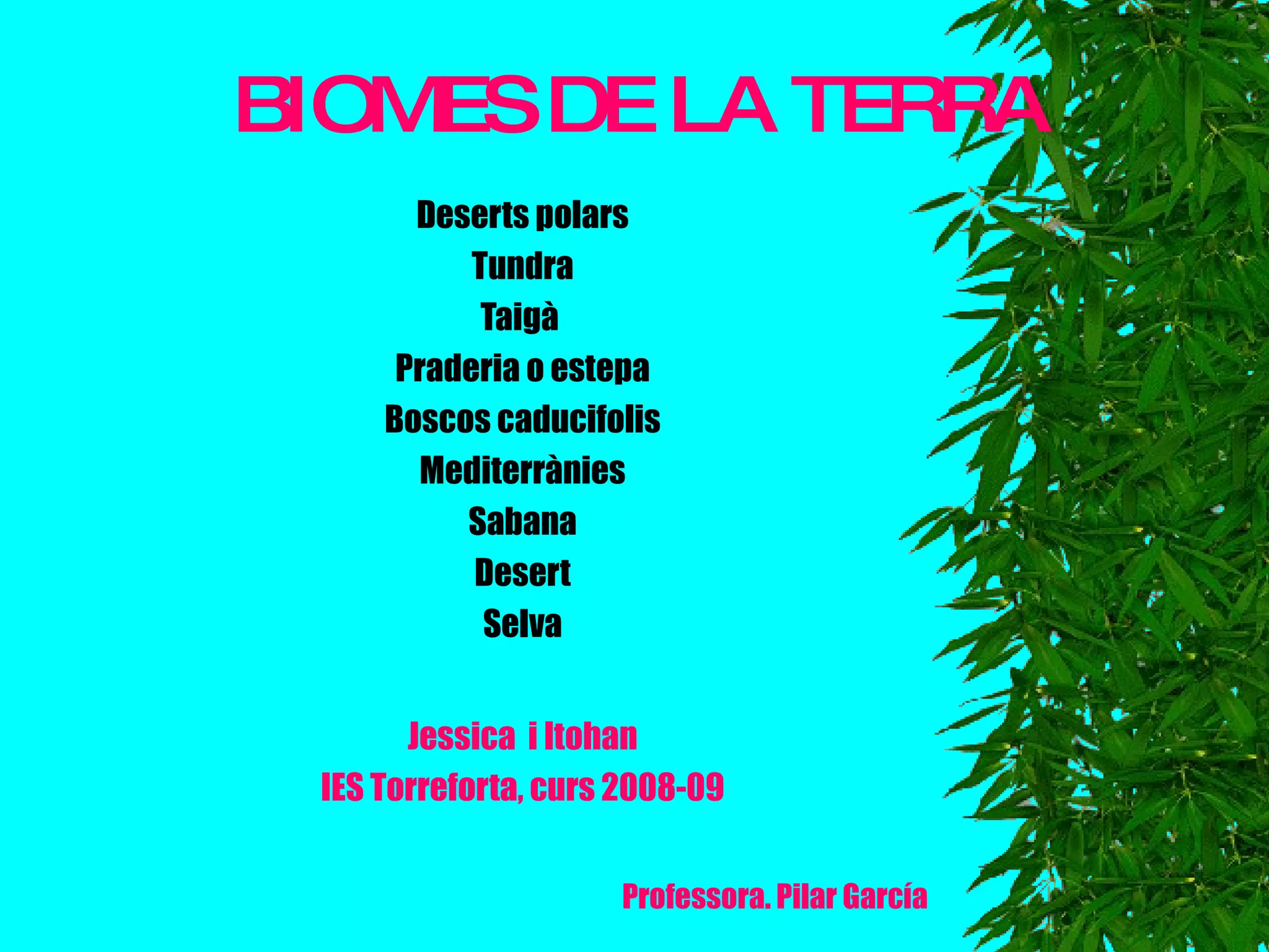 BIOMES DE LATERRA Deserts polars Tundra Taigà Praderia o estepa Boscos caducifolis Mediterrànies Sabana Desert Selva Jessica i Itohan IES Torreforta, curs 2008-09 Professora. Pilar García