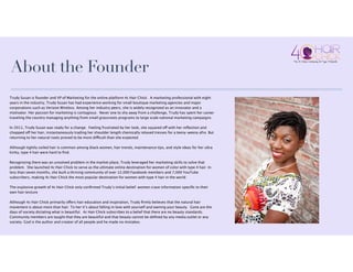 Trudy Susan founded 4c Hair Chick in 2011 to provide a online community and resources for women with very curly, tight type 4 hair. She built the platform through social media engagement, growing a Facebook community of over 12,000 members and 7,000 YouTube subscribers in under seven months. 4c Hair Chick serves as the leading online destination for type 4 hair care tips, trends, and inspiration. The platform focuses on celebrating natural beauty and empowering women through its hair education content and community.