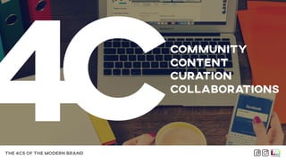 The document discusses the '4 Cs of the Modern Brand'—Community, Content, Curation, and Collaborations—as essential elements for retailers to effectively launch and market products and create value. It emphasizes the importance of fostering social connections among customers, creating engaging content, personalizing customer experiences, and collaborating with culturally relevant brands. Examples from companies like Rapha, Dôen, Adidas, and IKEA illustrate how these elements can drive competitive advantage and customer loyalty.