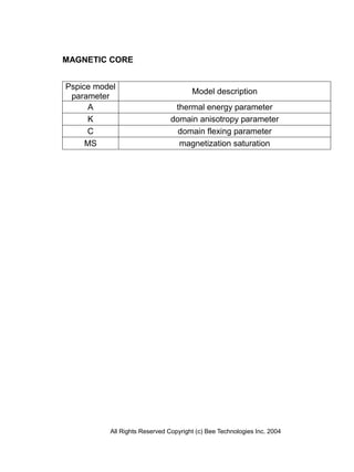 This document reports on the modeling of a magnetic core component. It provides the part number, manufacturer, and descriptions of the Pspice model used to simulate the hysteresis curve characteristics. Simulation results are presented in graphs and a comparison table shows good agreement between measured and simulated magnetic flux density values with most errors under 1%.