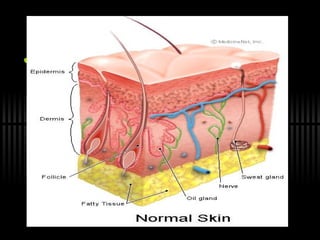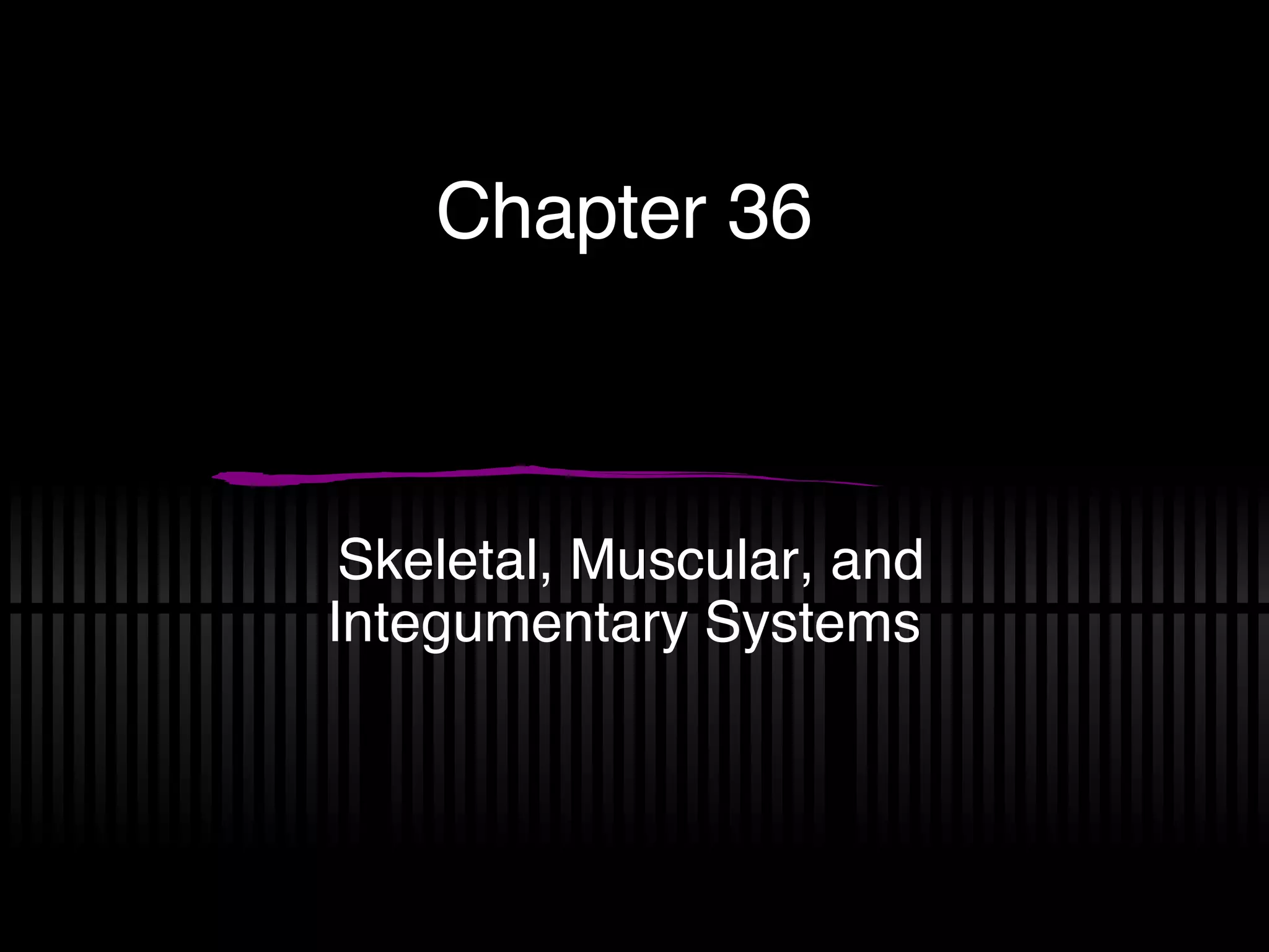 The skeletal system supports the body, protects internal organs, provides movement, and stores minerals. There are three types of joints: immovable, slightly movable, and freely movable. The muscular system contains three types of muscle tissue and muscles contract to allow movement. The integumentary system is made up of skin, which acts as a barrier, protects against injury, regulates temperature, removes waste, and protects against sun radiation.