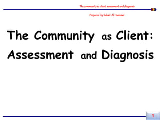 The document discusses community assessment and diagnosis from the perspective of viewing the community as the client. It describes the three dimensions of a community - location, population, and social system. For each dimension, it lists important variables to consider such as geographic features, climate, population size, density, and mobility. It also discusses the importance of understanding a community's social systems, such as its health system, family system, and economic system. Finally, it briefly introduces the topic of different types of community needs assessments.