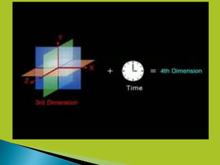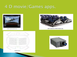 This document discusses various applications of 4D technology including 4D cinema, games, buildings, ultrasound, and a virtual human caveman project. 4D cinema combines 3D movies with physical effects like movement and smells. 4D ultrasound provides 4D images of a fetus over time. The caveman project aims to create virtual maps integrating medical data about diseases with a digital human body atlas.