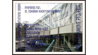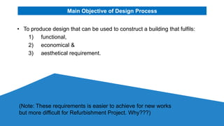 The document discusses the design process for refurbishing an existing MPK building in Klang, Malaysia. It provides background on the original building and the objectives of the refurbishment project. The refurbishment involved demolishing parts of the existing structure and constructing new sections. Drawings show the original building layout and proposed demolitions and new construction. Comments note issues with the existing building's performance and recommendations to address safety, indoor environment, and workspace concerns in the refurbished design. Interior images are included to showcase the building before and after refurbishment.