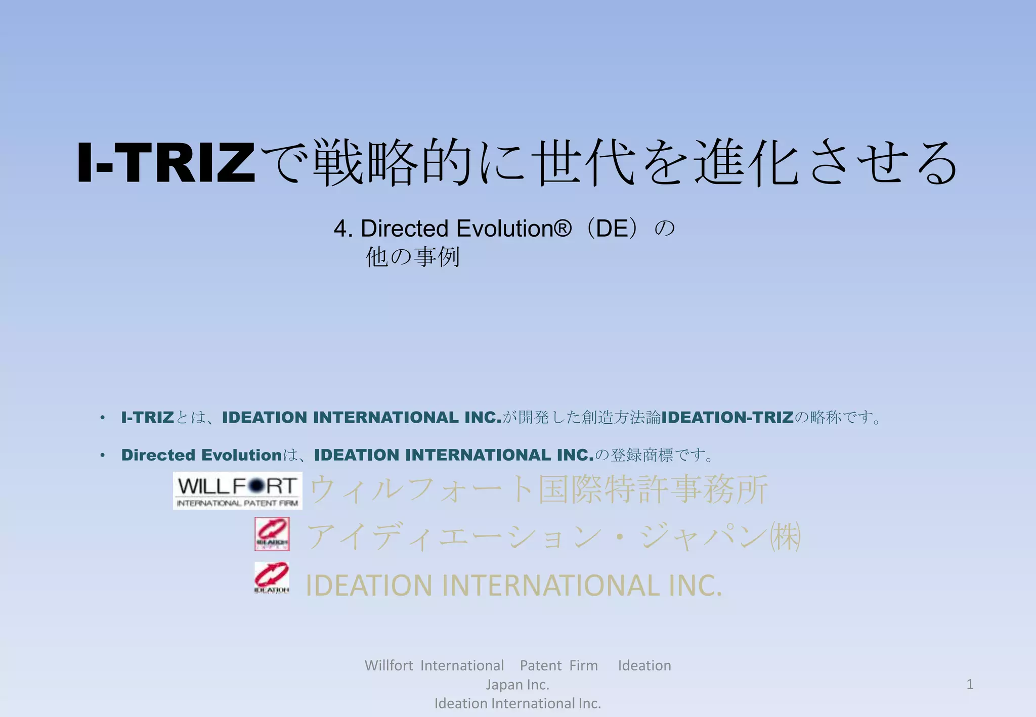 Willfort International Patent Firm Ideation Japan Inc. Ideation International Inc.I-TRIZで戦略的に世代を進化させる4. Directed Evolution®(DE)の他の事例 I-TRIZとは、IDEATION INTERNATIONAL INC.が開発した創造方法論IDEATION-TRIZの略称です。