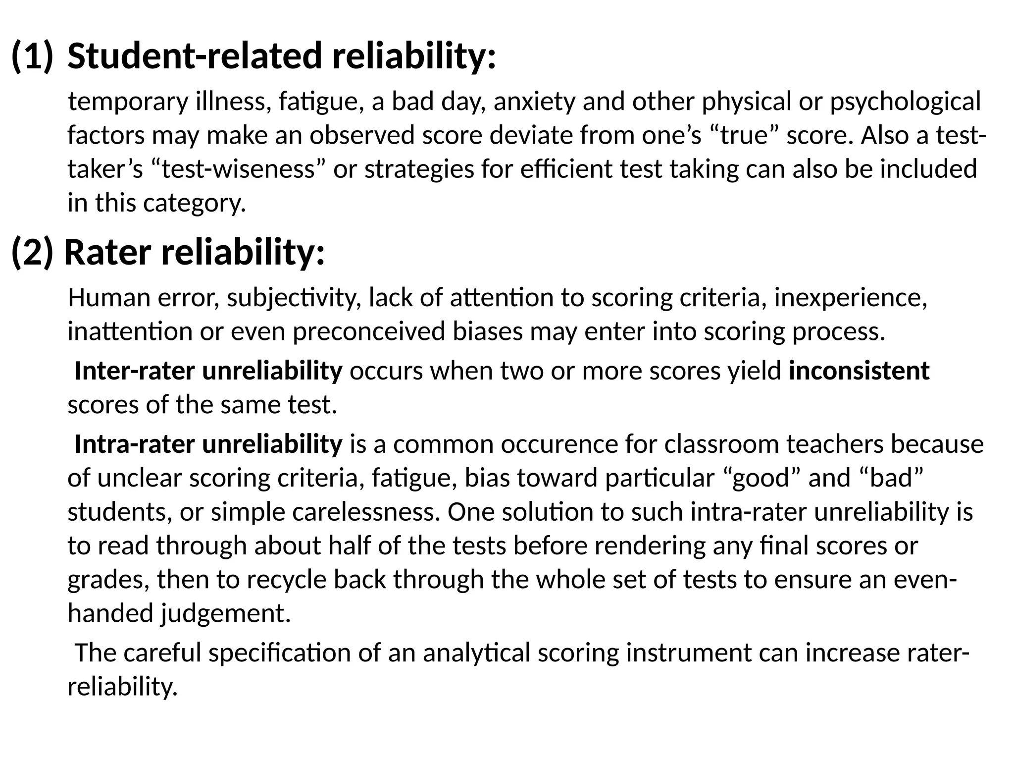 The document discusses the concept of reliability in testing, highlighting various factors that can contribute to unreliability such as student-related issues, rater inconsistencies, test administration conditions, and inherent test characteristics. It explains methods for calculating reliability, including internal consistency measures like the split-half and Kuder-Richardson formulas, as well as external reliability through test-retest and equivalent-forms methods. The overall aim is to establish dependable measures of test scores to ensure accurate evaluations of test-takers' abilities.
