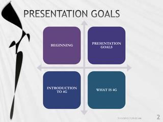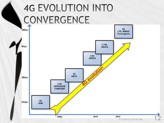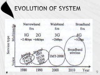 4G is the fourth generation of cellular network technology providing broadband Internet access. It aims to achieve ultra-broadband speeds in gigabits per second allowing users to download movies within 5 minutes. 4G uses packet switching and allows streaming of high-definition media to mobile devices. The first commercial 4G networks launched in Scandinavian countries in 2009. While some countries have started 4G, India is still working to fully implement 3G and likely won't deploy 4G until LTE technologies are more available. 4G will enable new mobile applications like telemedicine, video conferencing, and improved multimedia usage.