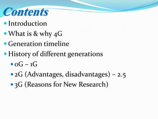 This document provides an overview of 4G technology, including its key features and evolution. It discusses the applications of 4G, the telecom companies developing 4G networks, the infrastructure required, and technologies used such as OFDM. The document also summarizes the effects of radio communications and concludes that 4G will converge networks and technologies, providing opportunities for carriers while changing people's lives.