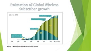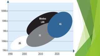 1) Wireless communication has evolved from 1G to 4G networks, with each generation offering faster speeds and new capabilities. 2) 4G networks provide broadband speeds up to 1Gbps using technologies like OFDMA, MIMO, and an all-IP packet switched network. 3) Key aspects of 4G include mobile broadband access, customized services, and support for multimedia and voice over internet protocol.