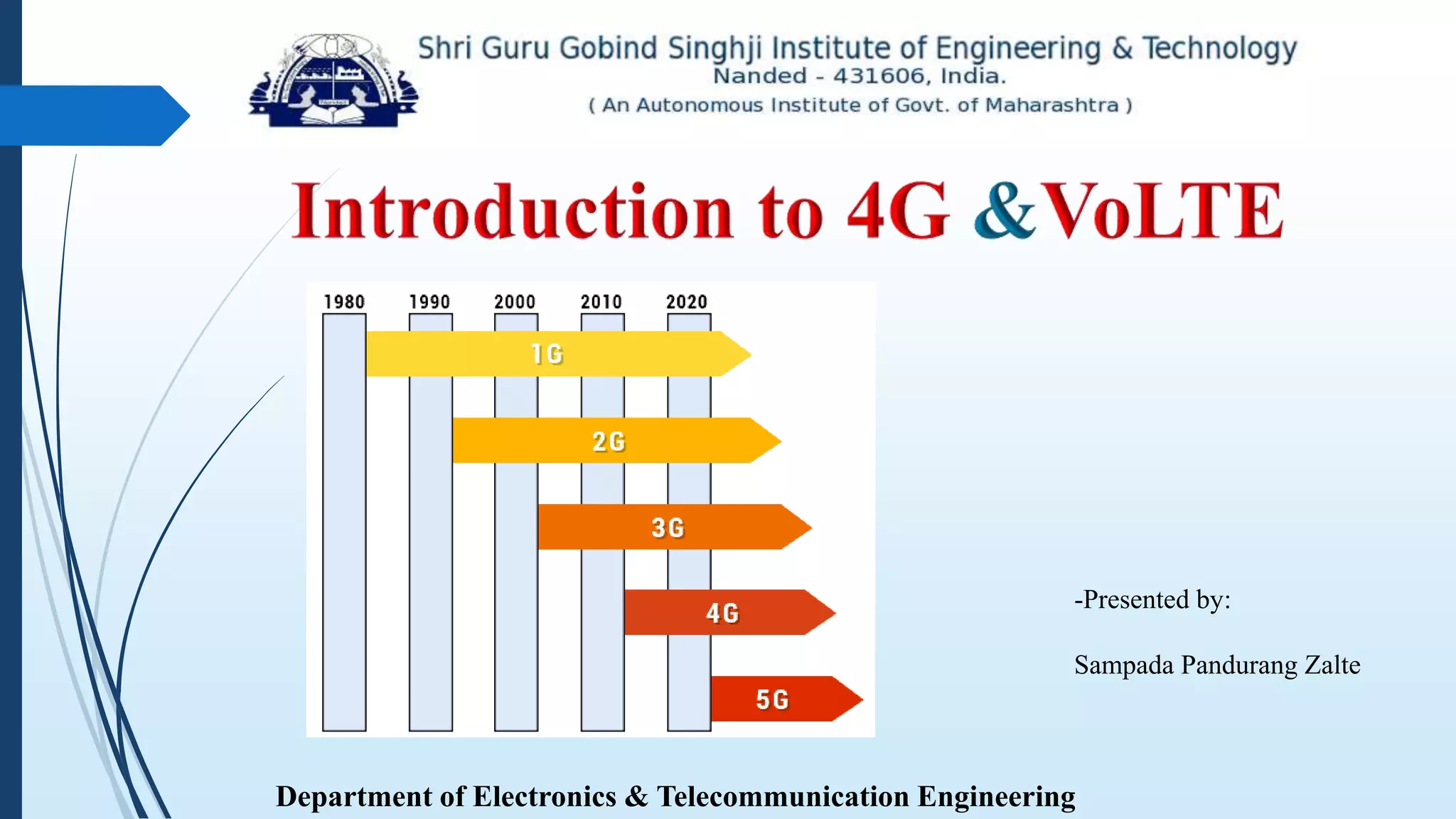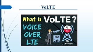 This document discusses Voice over LTE (VoLTE) technology. It provides an overview of the evolution of mobile communication standards and highlights key events in the deployment of 4G LTE networks and VoLTE services around the world between 2014-2016. The document also examines the architecture and working model of VoLTE, lists its features and applications, and discusses the merits and demerits of VoLTE compared to earlier mobile communication technologies.
