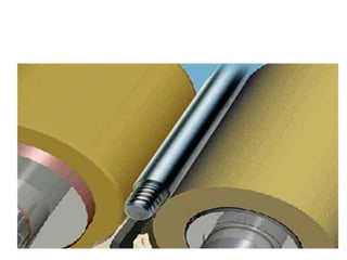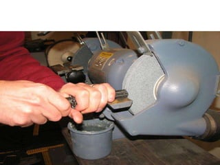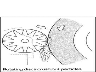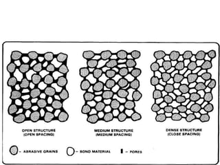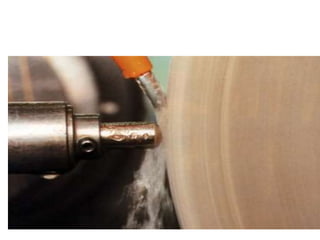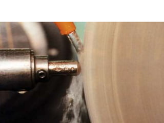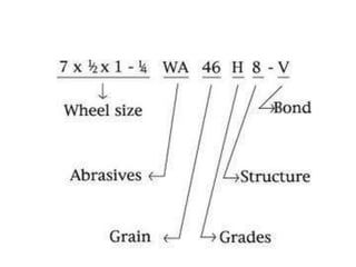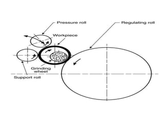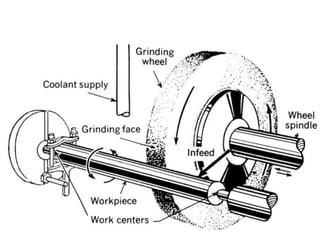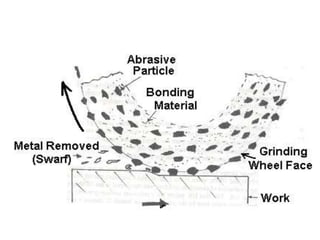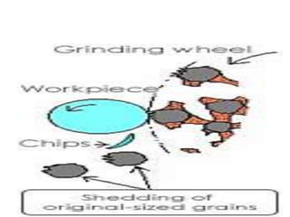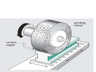 Grinding is a finishing process that involves removing small amounts of material from the workpiece through mechanical abrasion. The grinding wheel, composed of abrasive grains bonded together, is rotated at high speeds and brought into contact with the workpiece to remove fine chips of material. Grinding provides improved surface finish and dimensional accuracy compared to other machining processes due to the small material removal and high wheel speeds involved.