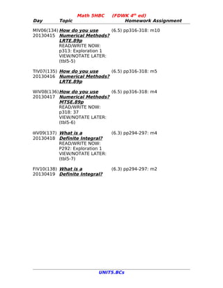 This document contains the schedule and lesson plan for a math class covering unit 5 on calculus topics like anti-derivatives, definite integrals, and numerical methods over 3 weeks. The schedule lists the daily topics, assigned readings, and homework problems. It includes lessons on finding anti-derivatives, solving differential equations, computing definite integrals, using numerical methods, and the Fundamental Theorem of Calculus.