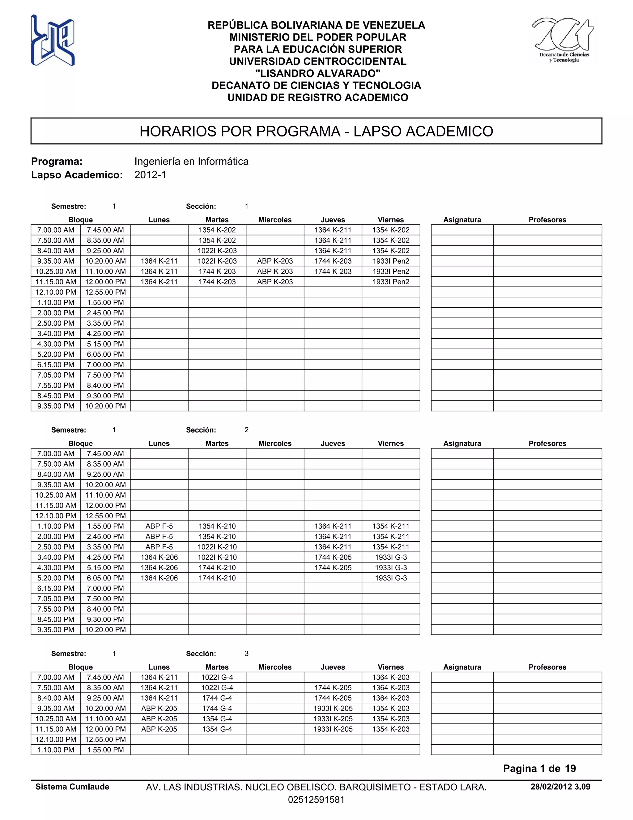 This document contains the class schedules for 8 sections of the Computer Engineering program at the Universidad Centroccidental Lisandro Alvarado for the 2012-1 academic period. It lists the course assignments, times, locations, and instructors for each class block on a weekly basis. The program includes courses such as Computer Programming, Computer Architecture, Algorithms and Programming Basics across the different sections and time slots.