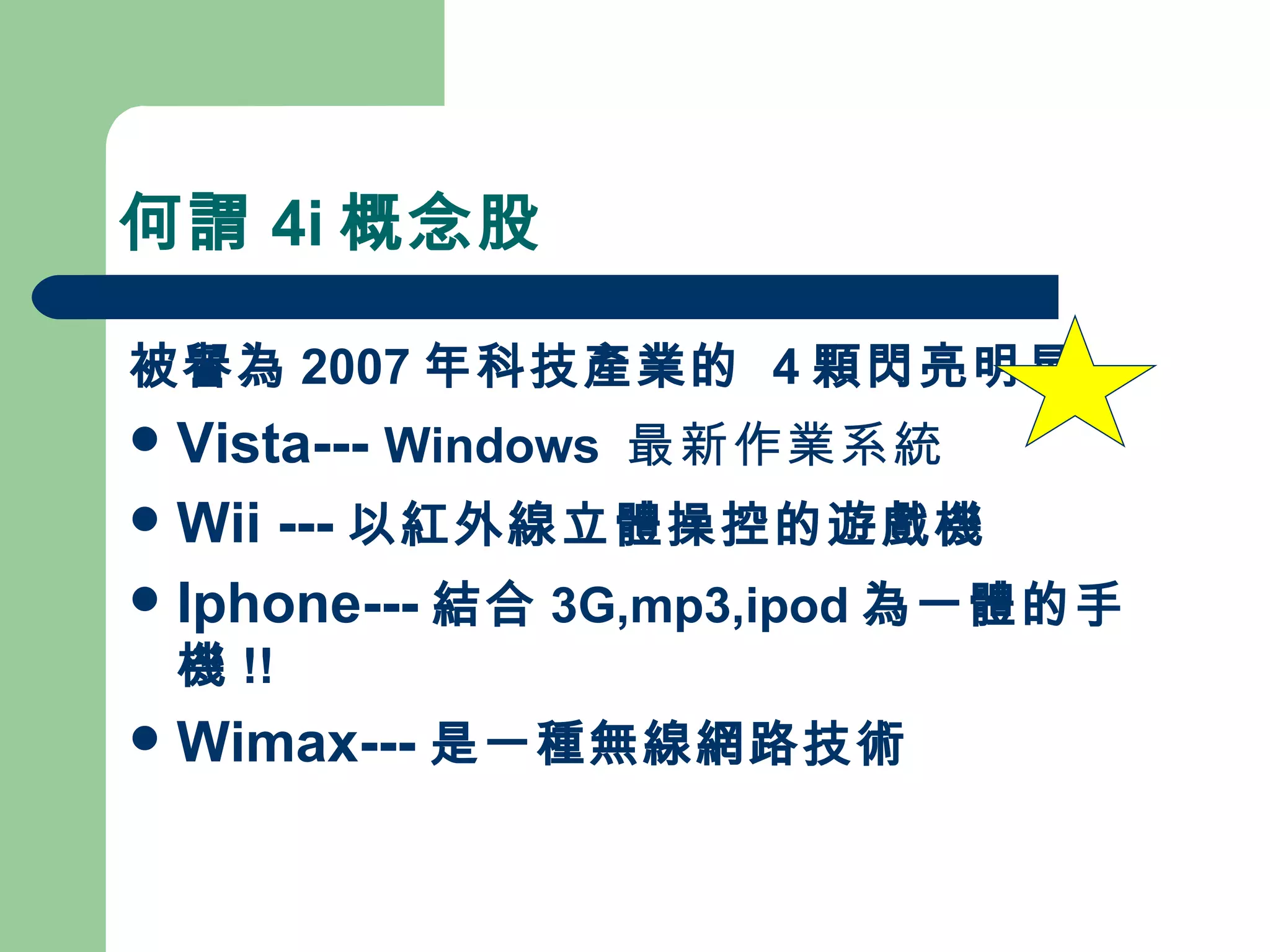 4i 概念股是指与 Vista、Wii、iPhone 和 WiMax 相关的科技产品,预计将在未来一年内带来新的商业机会。文档详细列出相关公司及其每股收益(EPS),强调台湾零组件厂商将在苹果 iPhone 推出时获益。文档建议投资者抓住时机投资尚未上涨的概念股,以期在节前获利。
