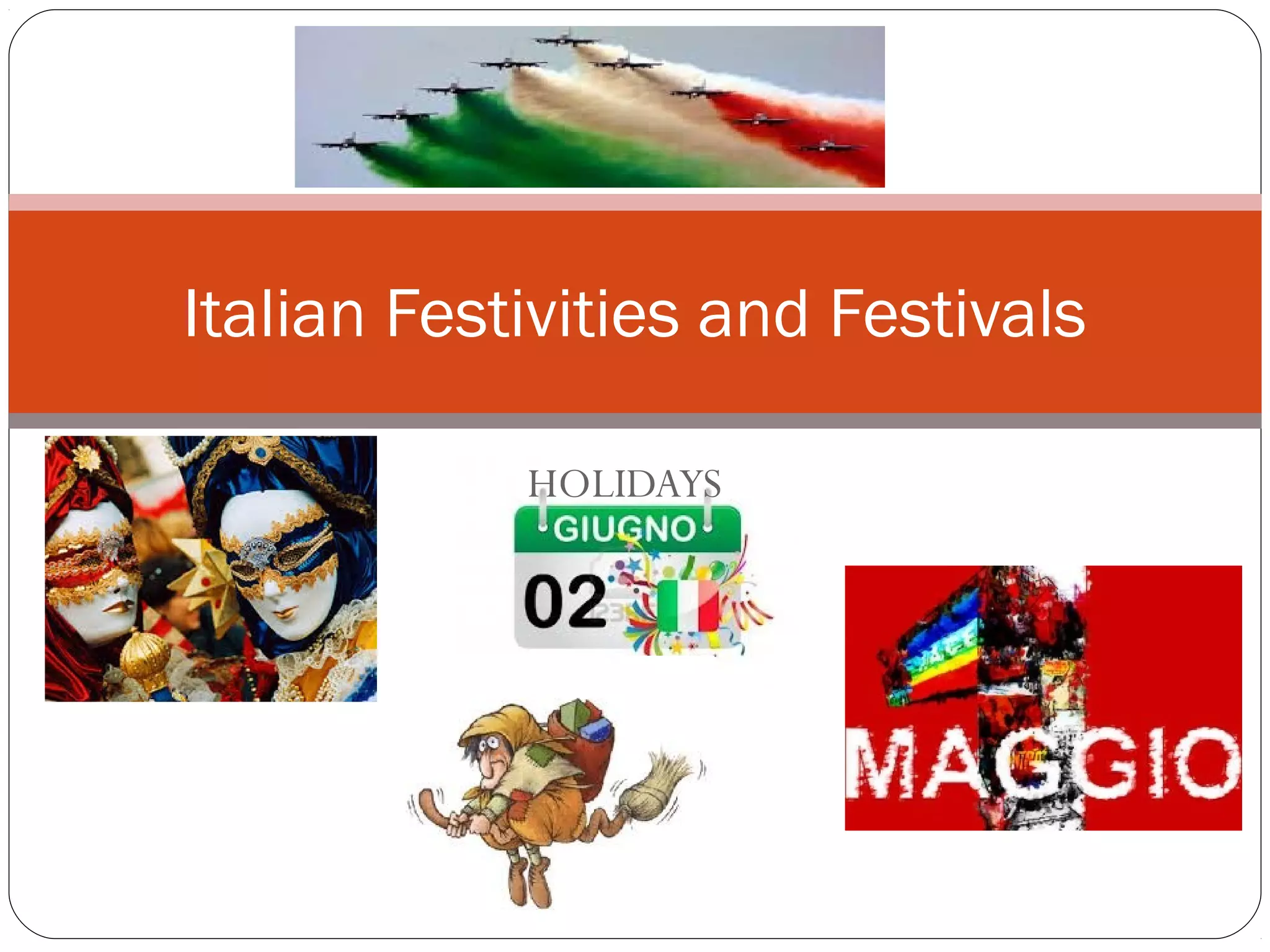 Italian holidays reflect Italian culture, history, and religion. National holidays include New Year's Day on January 1st and Liberation Day on April 25th, commemorating the end of WWII. Many towns also celebrate the feast day of their patron saint. Religious holidays like All Saints Day on November 1st are observed, and Italians often extend weekends around holidays into long weekends. Italy celebrates both national and religious holidays with feasts and festivals across the country throughout the year.