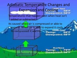 This document discusses various atmospheric processes that lead to cloud formation and precipitation. It covers topics like adiabatic cooling and warming, orographic and frontal lifting, convection, stability, condensation, different cloud types based on altitude, precipitation processes like the Bergeron process and collision-coalescence, and types of precipitation including rain, snow, sleet, glaze and hail. The document provides information on the mechanisms and conditions required for various cloud and precipitation formation.